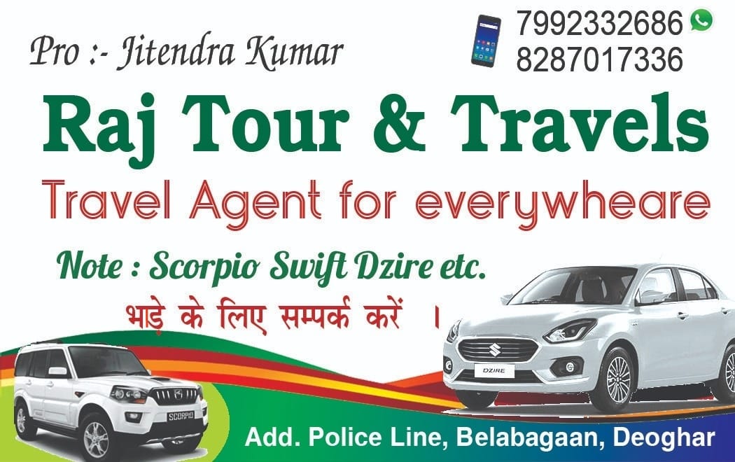 Raj Tour & Travels, proudly managed by Jitendra Kumar, is a trusted travel service based in Belabagaan, Deoghar. We specialize in providing reliable and comfortable transport solutions for local and outstation journeys. Whether you're planning a family trip, pilgrimage, business travel, or airport transfers, we offer well-maintained vehicles such as Scorpio, Swift Dzire, and more. Our commitment to customer satisfaction and punctual service sets us apart in the region. We cater to all kinds of travel needs with a focus on safety, affordability, and convenience. With experienced drivers and 24/7 availability, Raj Tour & Travels ensures that your travel experience is smooth and stress-free. Located conveniently near the Police Line in Deoghar, we are just a call away for any travel-related assistance. Contact us today to book a ride that is both comfortable and reliable. Raj Tour & Travels – your dependable partner for every journey.